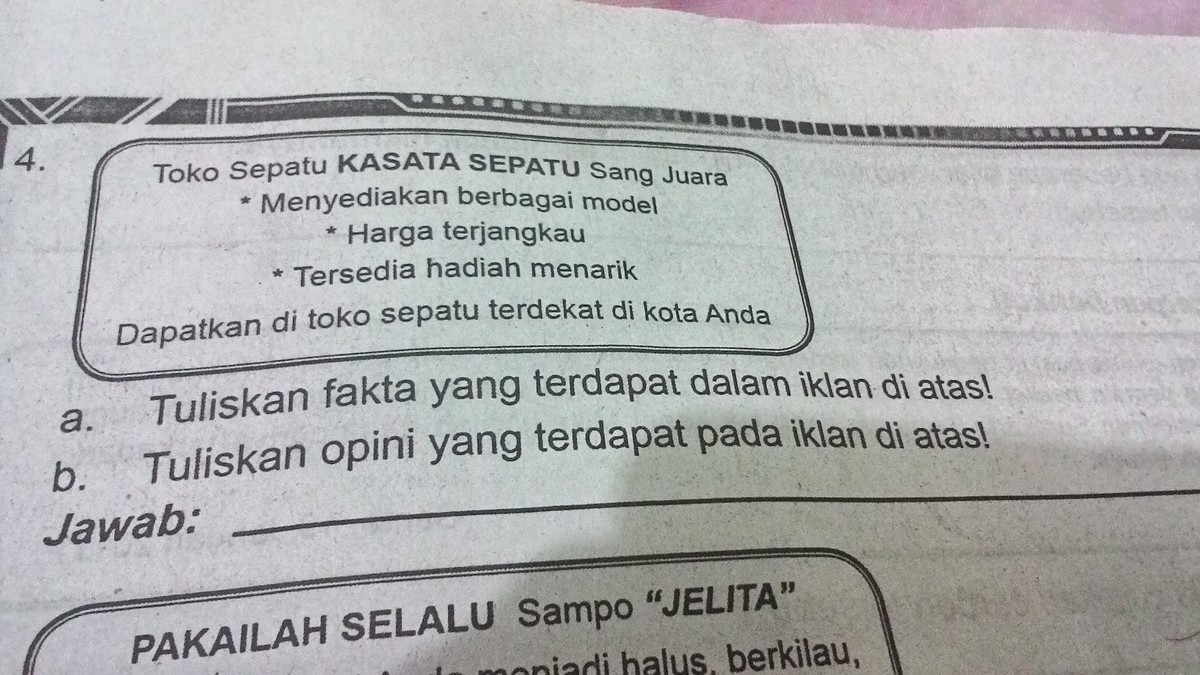 Sedangkan yang dimaksud opini dalam teks iklan adalah kata atau kalimat dalam iklan yang tidak berupa fakta, melainkan berupa pendapat, yang mendukung . Tergolong kedalam fakta sebab shampoo tersebut terbukti benar. Pelumas warna cat itu akan menjadikan mobil anda berkilau sebening kaca. Singkatnya, fakta ialah sesuatu hal yang terbukti dan . Untuk lebih memahami lebih dalam tentang fakta dan opini, .